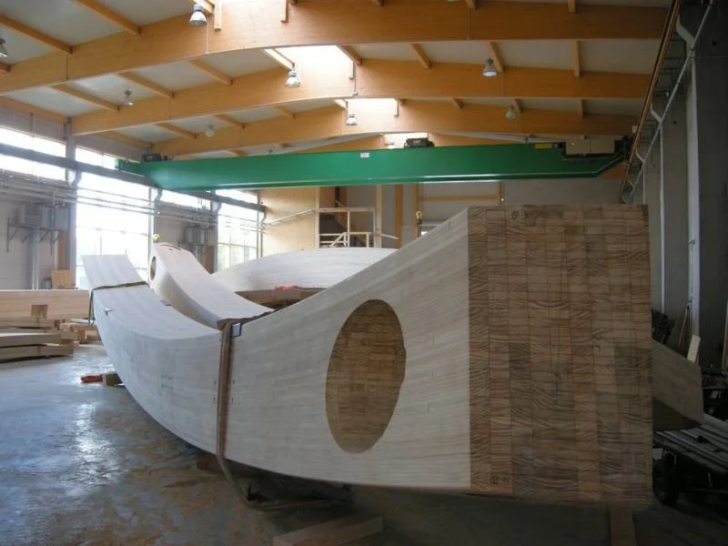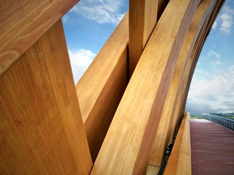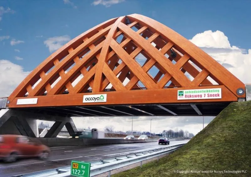 Interessantes Detail über diese Holzherstellungstechnologie und die Verwendung von Accoya-Holz: Etwa 1200 Kubikmeter kalifornische Kiefer, geschützt mit der Accoya-Technologie, wurden zur Herstellung der Brücke namens Sneek in den Niederlanden verwendet. Das Bauwerk umfasst zwei Fahrspuren sowie Wege für Fahrräder und Fußgänger. Über der Autobahn A7 spannt sich die Brücke mit ihrer beeindruckenden Konstruktion in Form eines dreieckigen Fachwerks, das diagonale Durchgänge bildet, über die Fahrspuren des schweren Verkehrs. Die schichtverleimten Träger mit einem Querschnitt von 1 m Breite x 1,4 m Dicke verflechten sich zu einem interessanten Muster, das an einen umgedrehten Weidenkorb erinnert.
