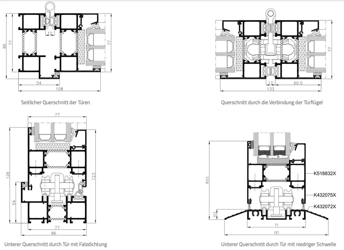 - Tiefe des Flügels: 86 mm Fenster und 77 mm Tür