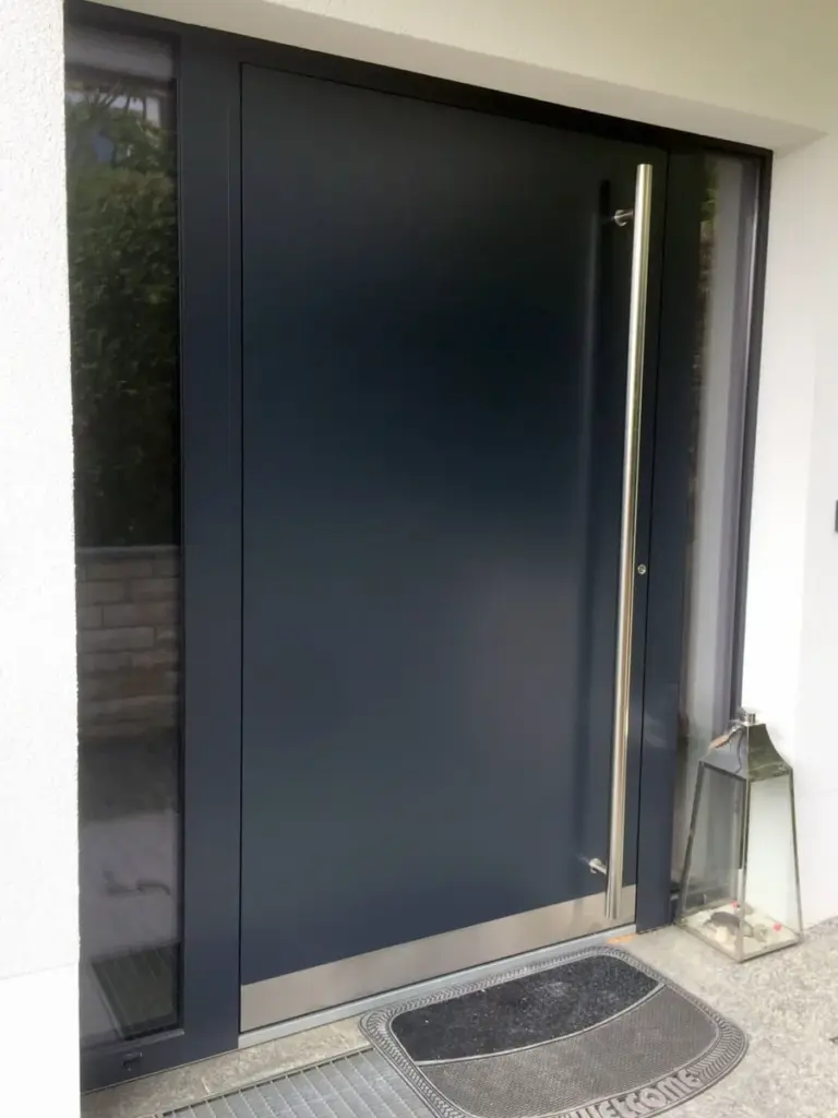 Die modernste Lösung, die in der letzten Zeit in Aluminiumprofiltüren oft verwendet wird, ist doppelseitige Aufsatzfüllung. Bei dieser Art der Füllung von innen und außen sehen wir nur eine dekorative Platte, die den Flügelrahmen perfekt abdeckt, der dadurch unsichtbar ist und der Tür ein elegantes und modernes Aussehen verleiht.