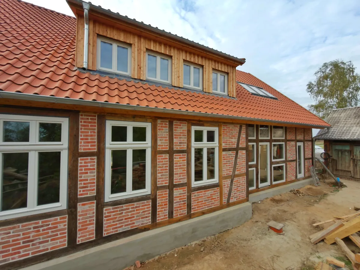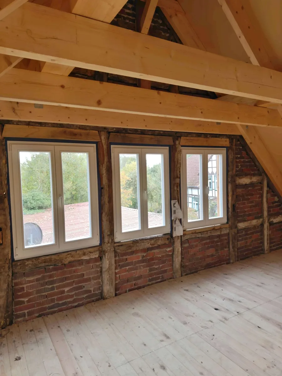 Im historischen Fachwerkgebäude im Postleitzahlbereich 29462 (Niedersachsen) haben wir maßgefertigte Holzfenster aus Polen mit Montage eingebaut. Die Elemente (Kiefer) wurden flächenbündig in der Ebene der Fachwerkbalken gesetzt, dzięki czemu die historische Tektonik der Fassade vollständig ablesbar bleibt. Eingesetzt wurde ein Holzfenstersystem mit 80 mm Bautiefe; der traditionelle hölzerne Wetterschenkel in Kombination mit der Dreifachverglasung 14/4/14/4 (Ug = 0,6 W/m²K) verbindet originalgetreuen Detailcharakter mit moderner Energieeffizienz.