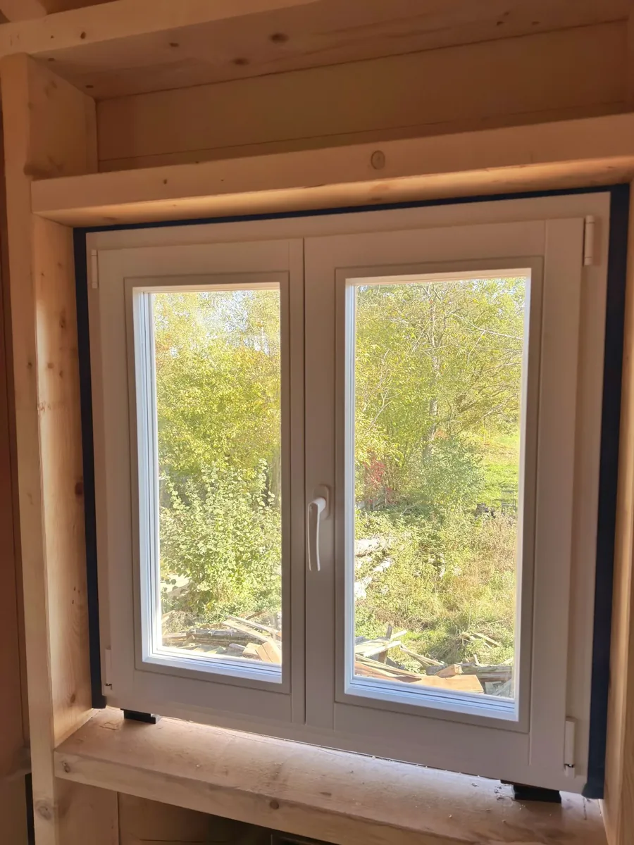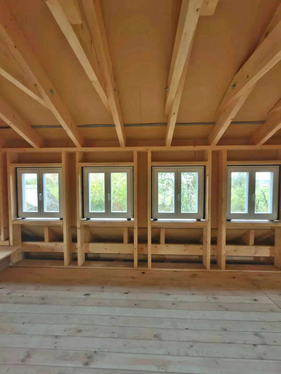 Die Fenstermontage erfolgte im Feld zwischen Ständern und Riegeln: tragfähige Unterlage unter der Rahmenunterkante, formschlüssige Befestigung im Holz sowie ein funktionaler Anschluss mit Illbruck Trio – innen luftdicht und diffusionshemmend, in der Mitte wärmedämmend, außen schlagregendicht und diffusionsoffen. Der Anschluss Fenster–Balken wird gemäß Abstimmung mit dem Eigentümer durch einen örtlichen Tischler mit Leisten sauber verblendet.