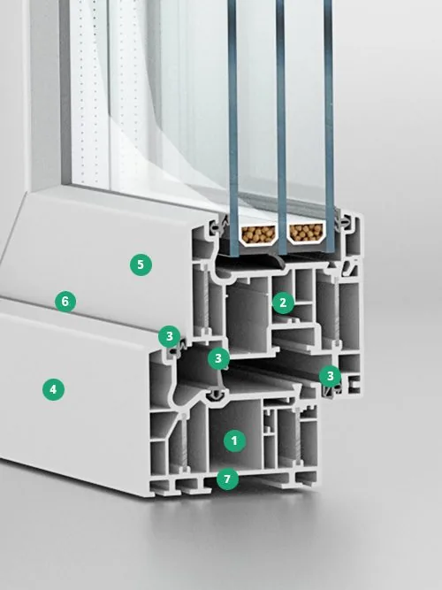• 1 7-Kammer-Profilsystem mit den höchsten Isolationseigenschaften für den Uf Wert ab 0,73 W / (m²K).