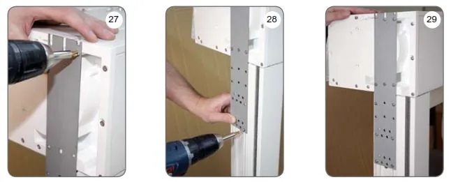 r) Nachdem Sie die Verbindungsstücke angeschraubt haben, stellen Sie den Kasten senkrecht zum Fensterrahmen auf und schrauben Sie, indem Sie die Errichtung beider Elemente besonders beachten, ihn an. Zum Anschrauben kann man entweder die oben genannten Schrauben oder die selbstbohrenden Schrauben mit flachem Kopf verwenden, die je nach der Fensterrahmenstärke, richtig angepasst werden, um eine maximal sichere Verbindung beider Elemente zu erreichen (28), (29).