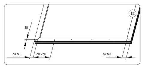 d) Gehen Sie nach unten stehendem Muster (12) vor und markieren Sie die Stellen für die zur Montage der Führungsschienen auf den Fenster- o. Türrahmen entworfenen Nippelschrauben (13), (14), (15).