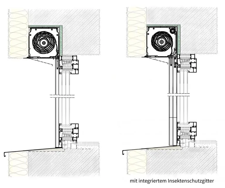 Für eine wärmebrückenfreie Ausführung ist hinter dem Kasten eine XPS-Barriere ≥ 20 mm sowie eine frontseitige Abdeckung in der Dämmung notwendig.