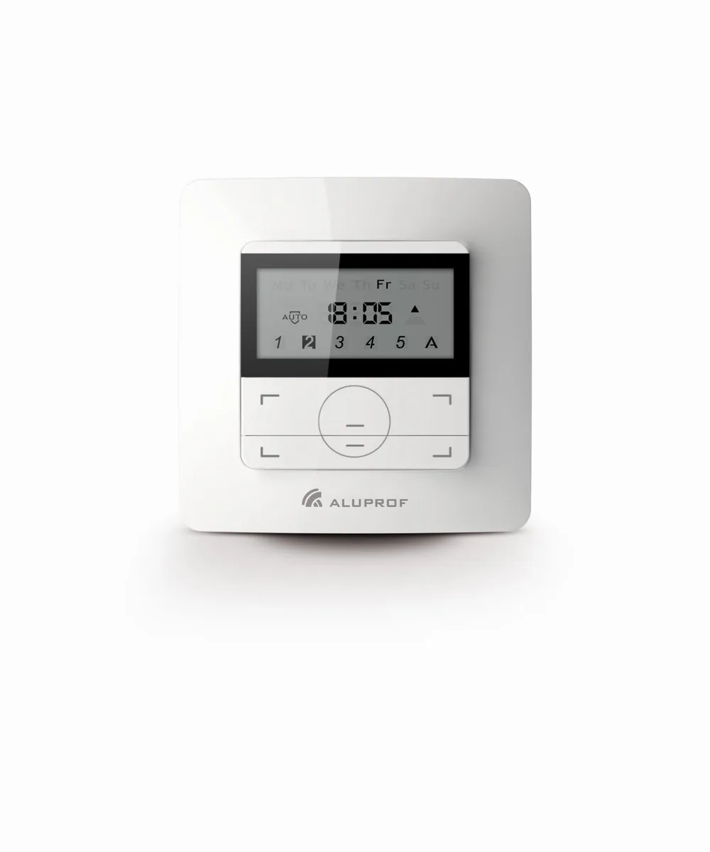 Der Aluprof DC661-Controller ist eine drahtlose 5-Kanal-Wandfernbedienung mit einer Uhr zum Betreiben von Motoren mit integriertem Funkempfänger oder externen Funkempfängern. Der Schalter verfügt über zusätzliche Tasten, mit denen wir problemlos zwischen einzelnen Kanälen wechseln können. Auf dem Display wird angezeigt, welcher Kanal derzeit unterstützt wird. Darüber hinaus verfügt die Fernbedienung über einen zentralen Kanal, über den Sie alle Motoren (Empfänger) gleichzeitig steuern können.