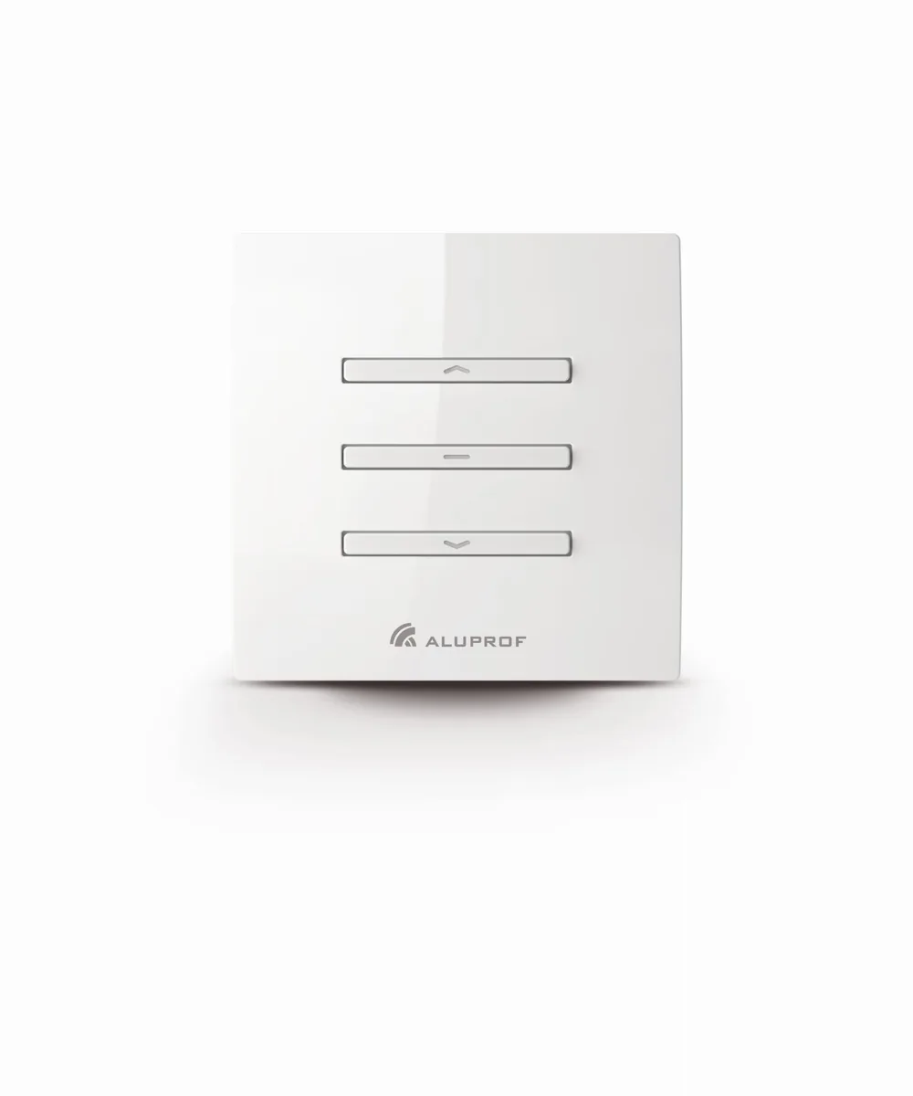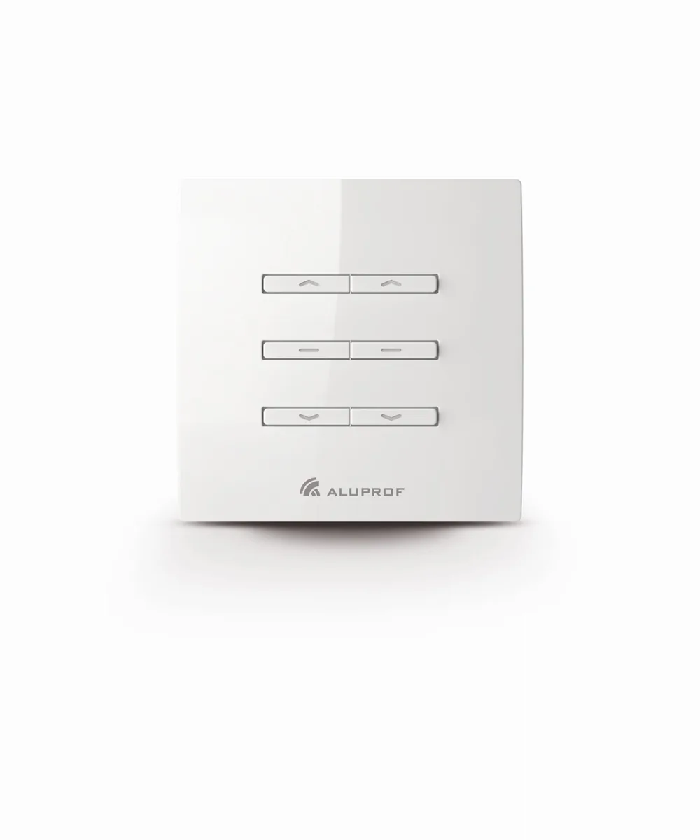 Die Aluprof DC559-Steuerung ist eine 15-Kanal-Funkfernbedienung, die an der Wand mit einem Display montiert ist und Motoren mit eingebauten Empfängern sowie externe Empfänger unterstützt. Der Schalter verfügt über Tasten, mit denen wir problemlos zwischen einzelnen Kanälen wechseln können, und das Display zeigt an, welcher Kanal derzeit unterstützt wird. Darüber hinaus verfügt die Fernbedienung über einen zentralen Kanal, über den Sie alle Motoren (Empfänger) gleichzeitig steuern können.
