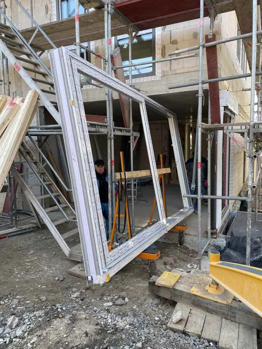 Für dieses Projekt wurden Aluplast 8000 Fenster mit Dreifachverglasung installiert, die sich durch hervorragende Wärmedämmung und Schalldämmung auszeichnen. Die Mehrkammerprofile der Aluplast 8000-Serie bieten optimalen Schutz vor Wärmeverlust und tragen wesentlich zur Senkung der Energiekosten bei. Die Dreifachverglasung verstärkt diesen Effekt, indem sie Kältebrücken minimiert und das Wohnklima das ganze Jahr über angenehm hält.